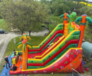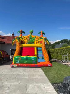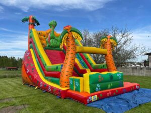 Zamek zjeżdżalnia gigant Dino – urządzenie przeznaczone dla dzieci od 3 roku życia. Długość ślizgu to 4,40 m. Sprawdzi się na festyn jak i na domową imprezę. Zamek służy do zjeżdżalnia.